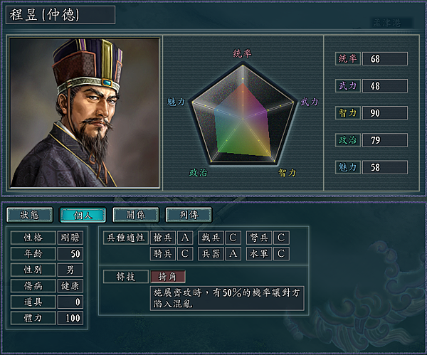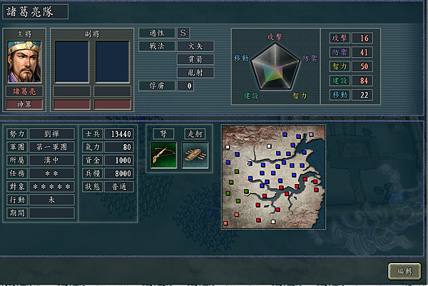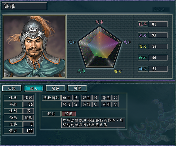 猛者:使敵人的移動區格戰法成功後,無論對手能力強弱,50%概率使敵將負傷