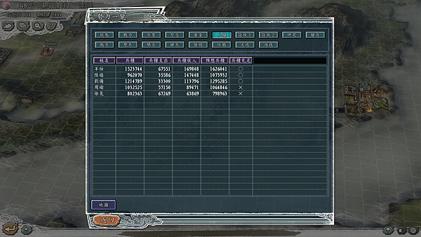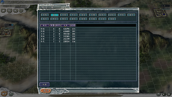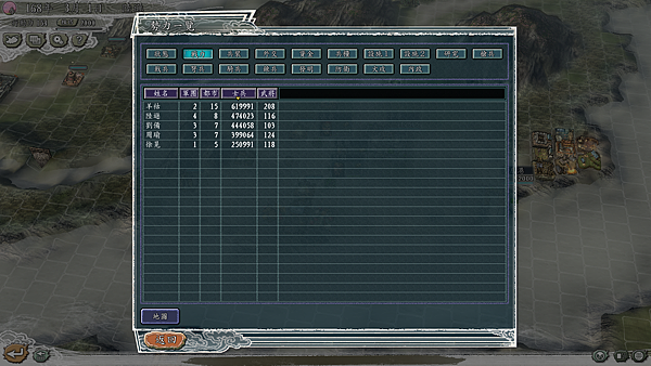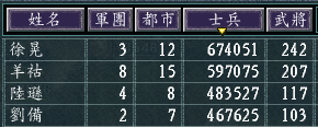 | 城市序號 | 城市名稱 | 玩家名稱 | 士兵 | 金錢 | 兵糧 | 槍 | 戟 | 弩 | 軍馬 |