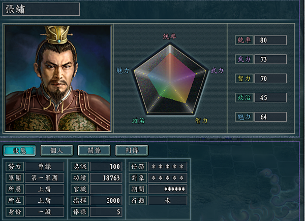 張繡(呂大):這次選擇張繡,是想測試自己能夠承受玩家操控的曹操多少攻擊,結果還真的差點招架不住,運用神風特攻與重金談和,才稍微阻止了曹操的攻勢,但不得不承認武關出騎兵隊就難以阻擋的事實。以後在宛開局,一定得要注意武關的動向,至少得蓋個箭樓阻擋才行。(名言:投降輸一半,活著最重要!)