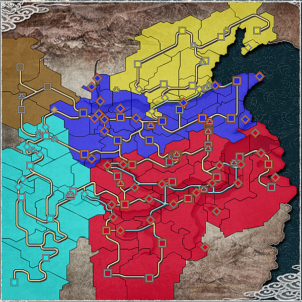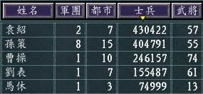 開局劉表佔領上庸、武陵,同時也往永安前進;沒被暗殺的江東小霸王孫策佔領中原的入口:壽春。