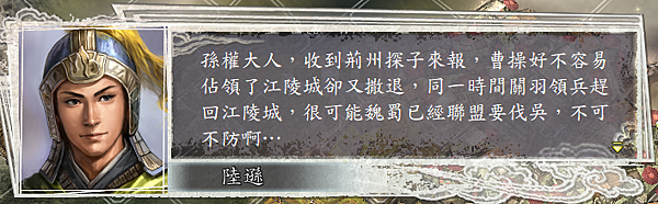 | 荊州觀光團 | 224-3 | 劉備 | 孫權 | 劉備 | 吳國全員北伐,荊州空虛 蜀漢荊州觀光團從永安出發 走訪(佔領)江陵、襄陽 觀光團並沒有久留,持續往經常換色的上庸前進 |