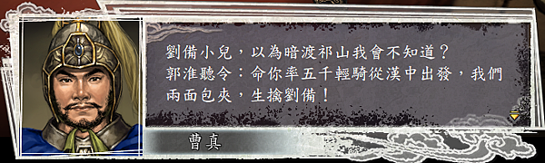 | 漢中爭奪戰 | 222-6 | 劉備 | 曹操 | 劉備 | 本篇的主旨 漢中爭奪在劉備第三次北伐正式易主 劉備成為漢中王(遲遲未觸發劇情,使用修改器讓劉備稱王) 劉備取得上庸(曹操棄城) 曹魏東、西兩方要塞雙雙失守,迫使曹操向孫權請求停戰 |