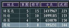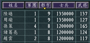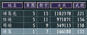 所有城市皆為大都市、滿兵150,000、各式兵裝全滿(100,000)、金50,000、糧500,000